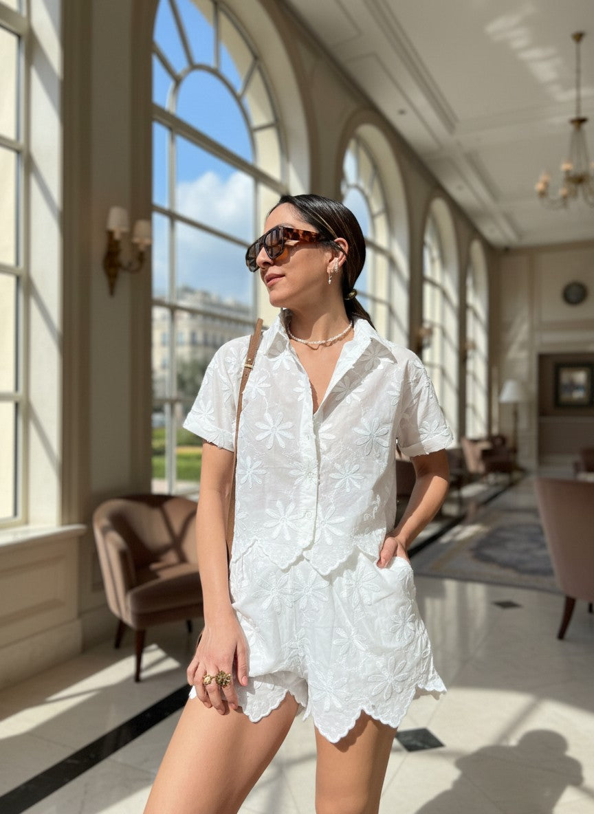 חליפת שורט בגוון לבן נקי עם רקמה עדינה וטקסטורה יוקרתית, שמעניקה מראה רך ומתוחכם בו זמנית. החולצה בגזרת כפתורים עם שרוול קצר וצווארון קלאסי, משתלבת באופן מושלם עם שורט מחמיא בגזרה גבוהה.
