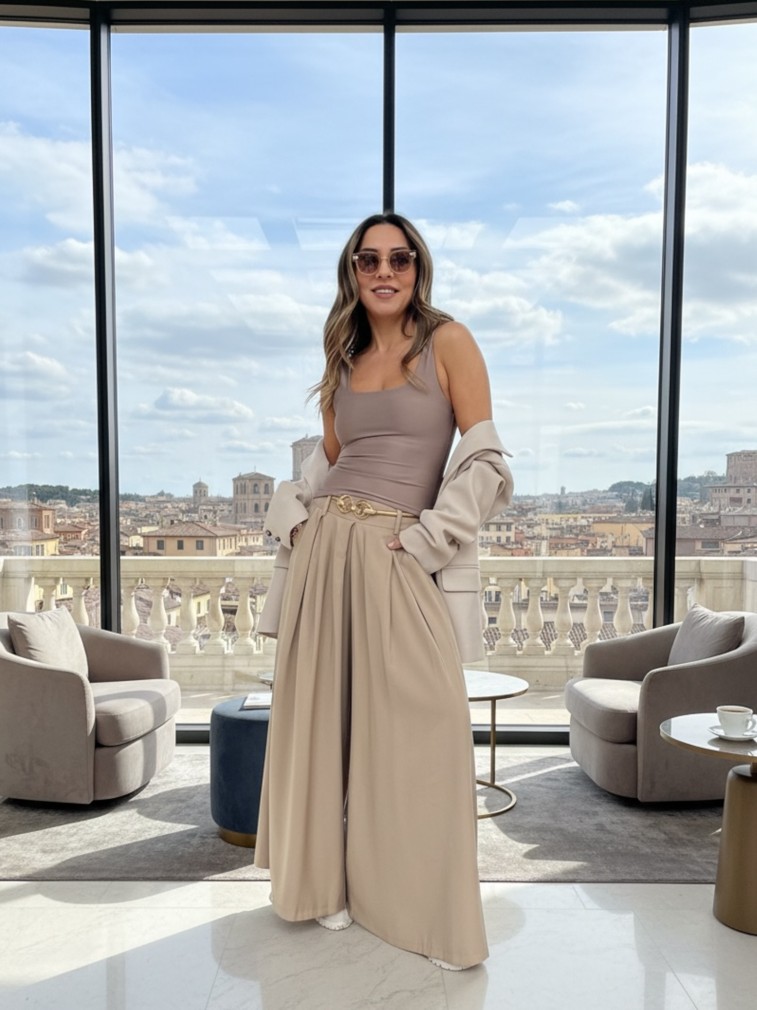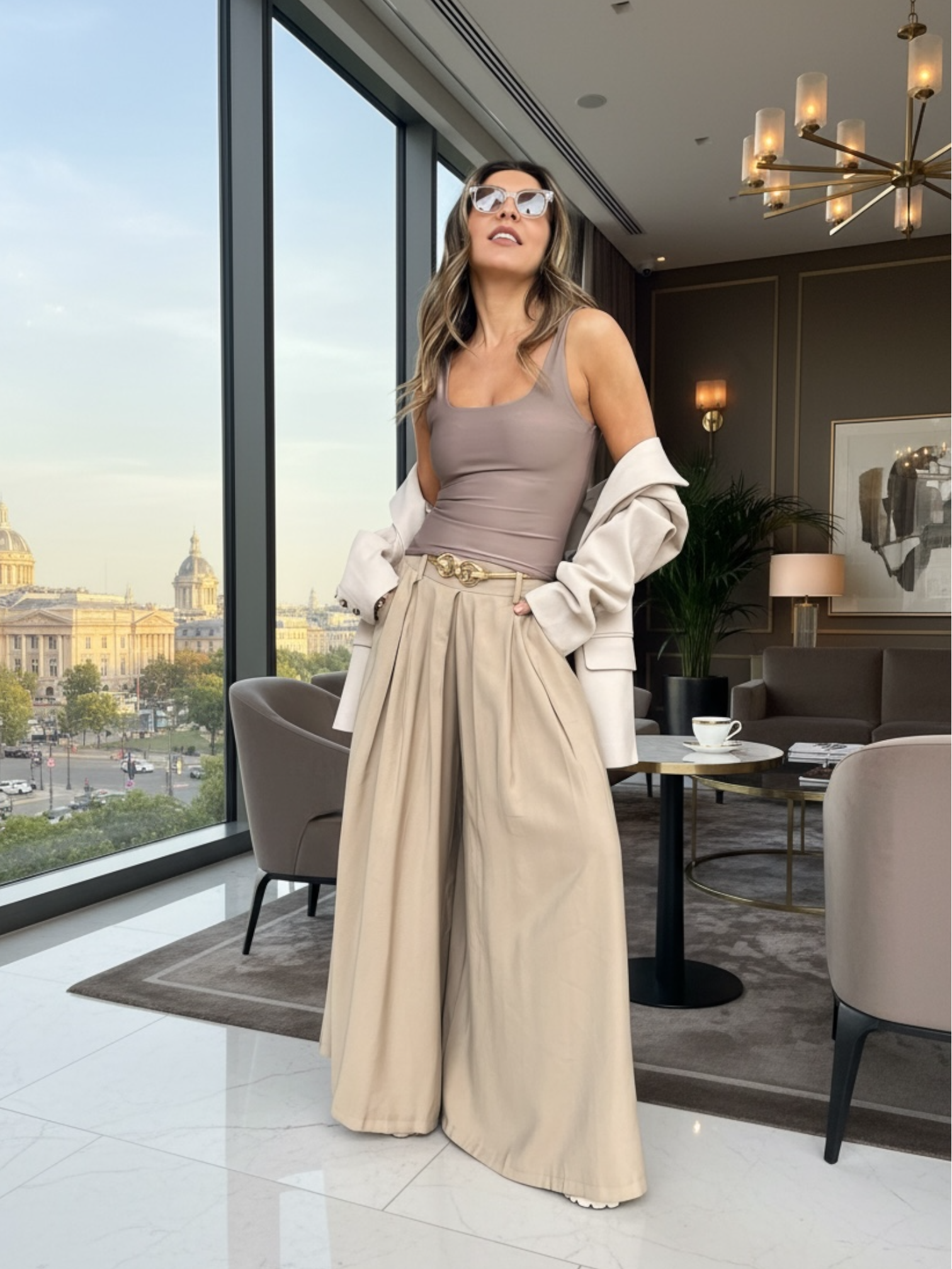 הפריט שיש בו הכול – גם נוחות, גם תנועה, וגם שיק בלתי מתאמץ. מכנס-חצאית בגזרה נשפכת בצבע חום קלאסי, שמחמיא לגוף ומרגיש כמו חלום. הבד קליל ורך, עם מראה מתוחכם שמתאים בדיוק לימי קיץ אלגנטיים.
