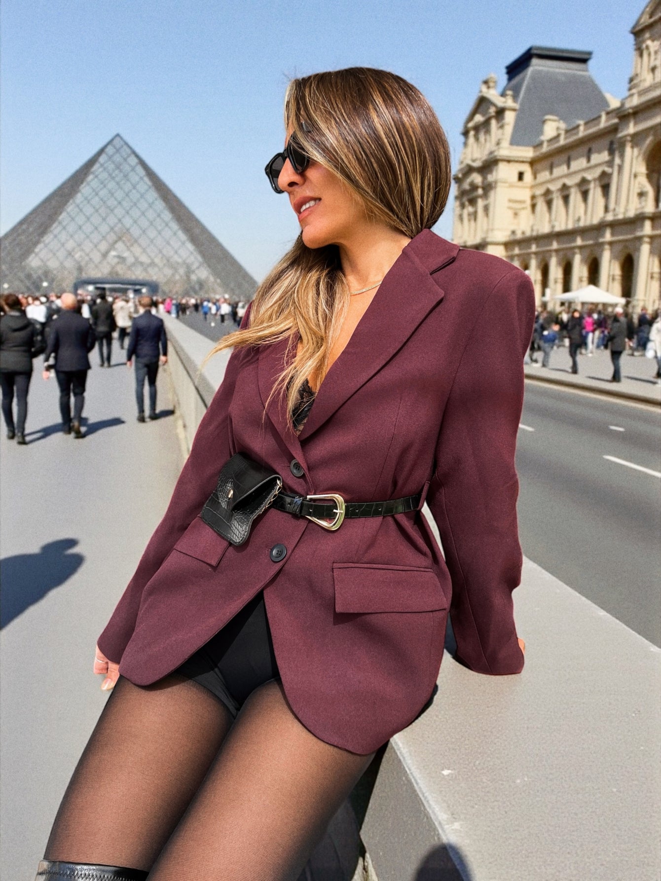 בלייזר מחויט בגזרה ישרה עם כתפיים מובנות, סגירה בכפתור קדמי וחגורת עור דקה עם פאוץ’ קטן ואבזם מוזהב.