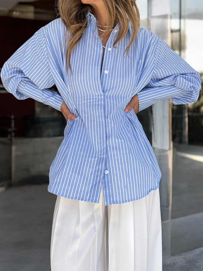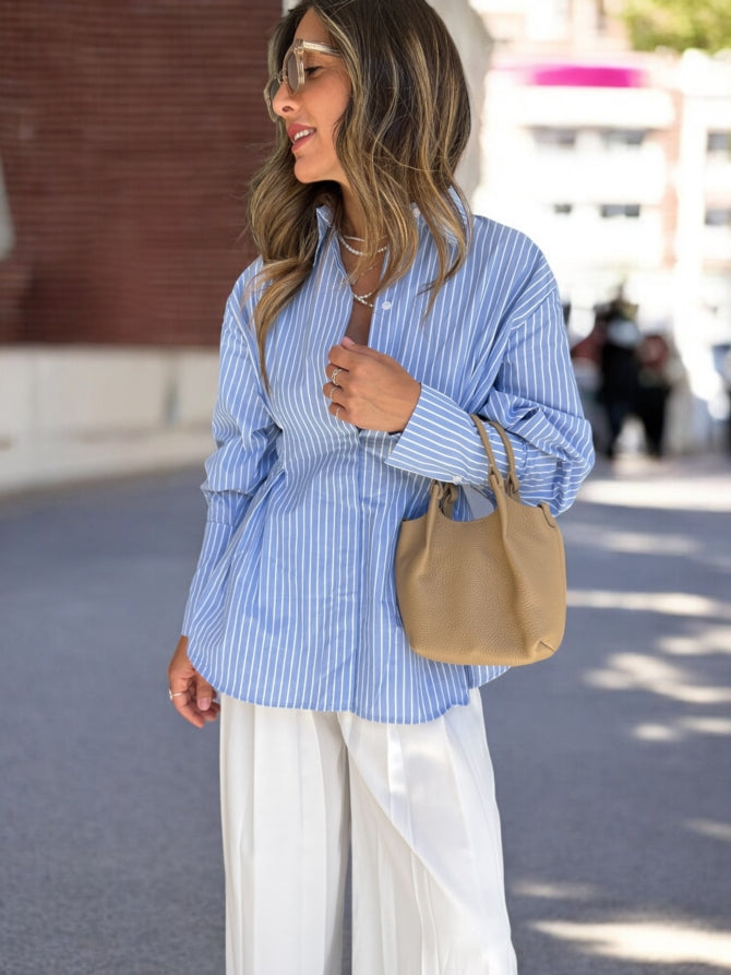 מכופתרת פסים טוניקת באורך מחמיא ונשפך, עשויה מבד קליל ונעים למגע. גזרה רפויה שמשדרת effortless chic – מושלמת לשילוב מעל ג'ינס, טייץ או אפילו כבגד חוף שיקי במיוחד.