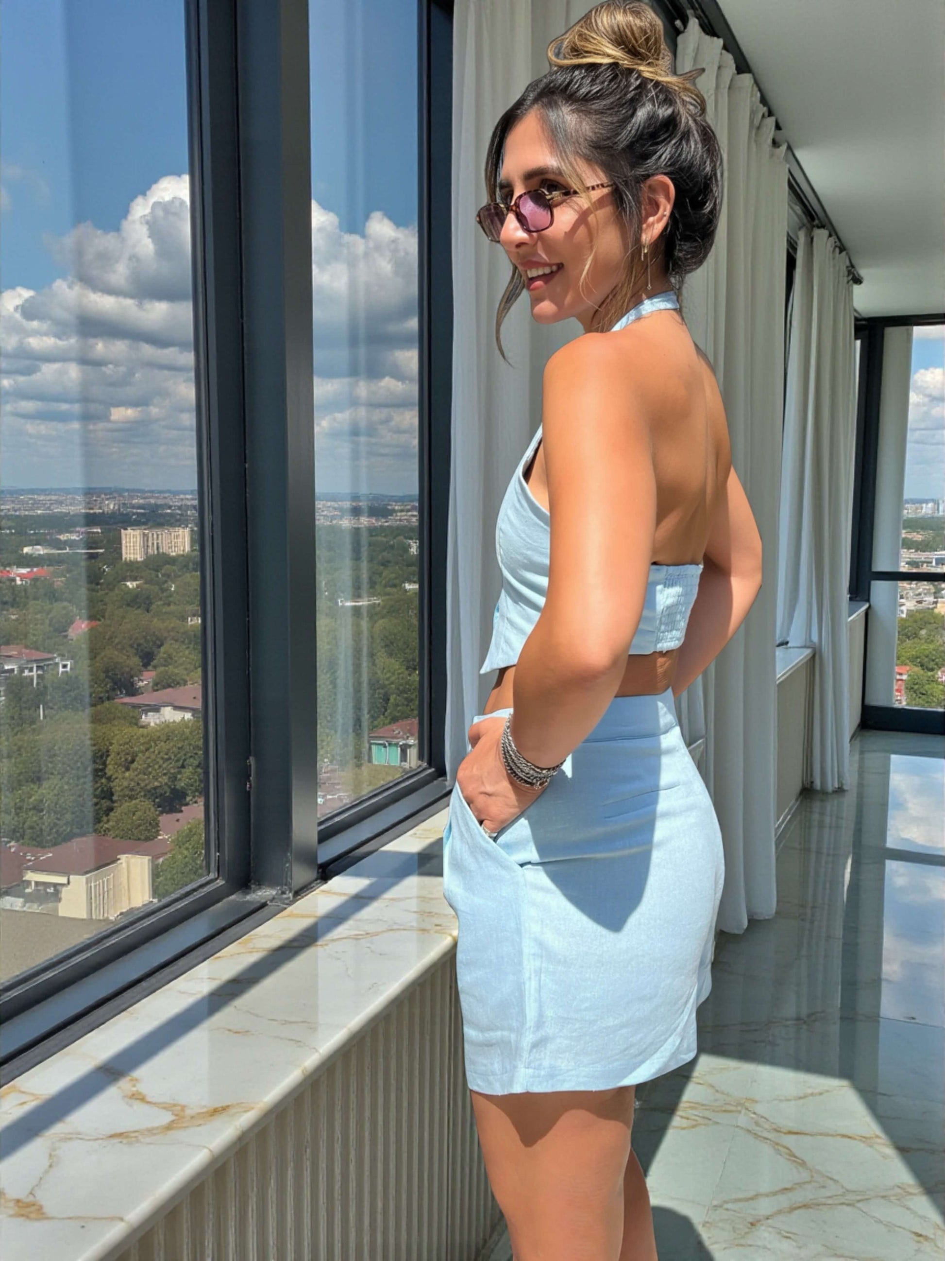 חליפה מחמיאה ומדויקת בקו נקי ואוורירי, עשויה בד לין נושם שמעניק מראה טבעי ויוקרתי. החלק העליון מעוצב בגזרת הולטר מחמיאה שמדגישה את הכתפיים והגב, והחלק התחתון מגיע בגזרת שורט/חצאית גבוהה שמעצבת את המותן ויושבת מושלם על הגוף.