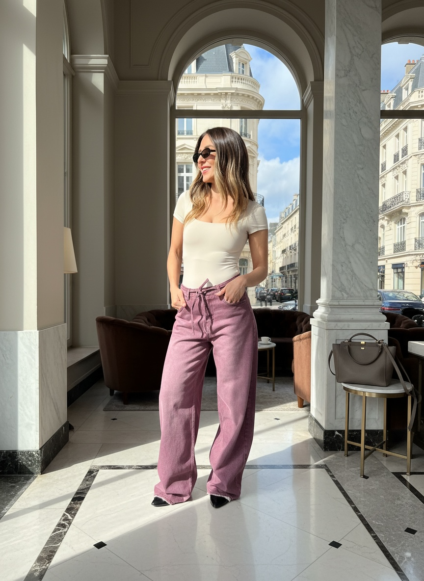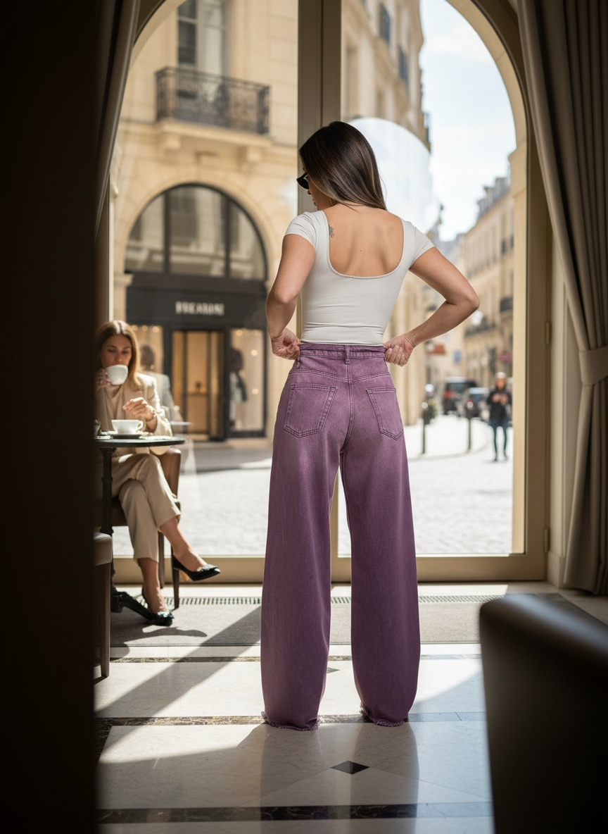 ג׳ינס בגזרה גבוהה ורחבה שיוצר סילואט נקייה, ארוכה ומחמיאה.