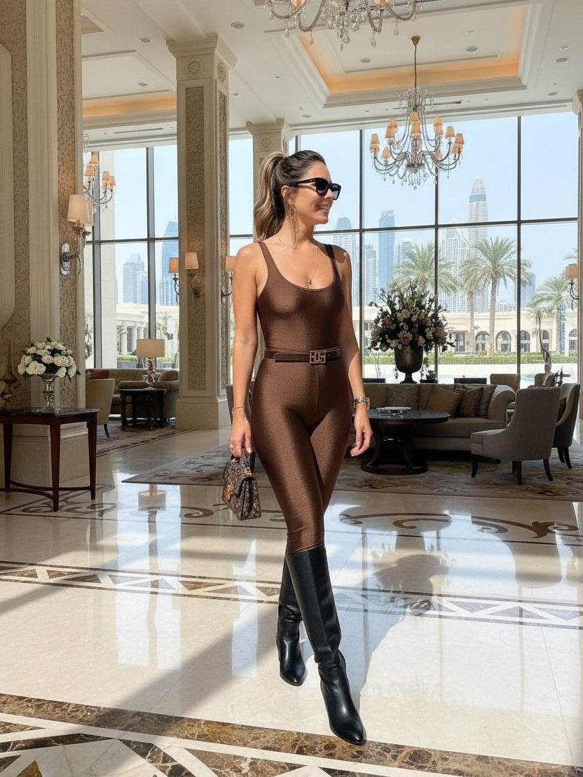 אוברול קימי עשוי מבד איכותי ומבריק, המספק מראה יוקרתי ומחמיא. הגזרה המחטבת מדגישה את קווי הגוף בצורה מושלמת, עם דגש על נוחות מקסימלית