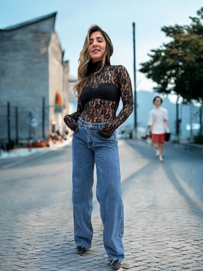הוסיפי נגיעה של אלגנטיות ונועזות למלתחה שלך עם בגד גוף רשת שקוף בשחור, המעוטר בפרחים עדינים להשלמת מראה מתוחכם וסקסי. העיצוב המחמיא מציג גזרה צמודה המדגישה את הקימורים, בשילוב בד רך ונושם לנוחות מרבית. מושלם ללבישה מתחת לז'קט מחויט לערב אופנתי או כפריט מרכזי בלוק נועז ומפתה.