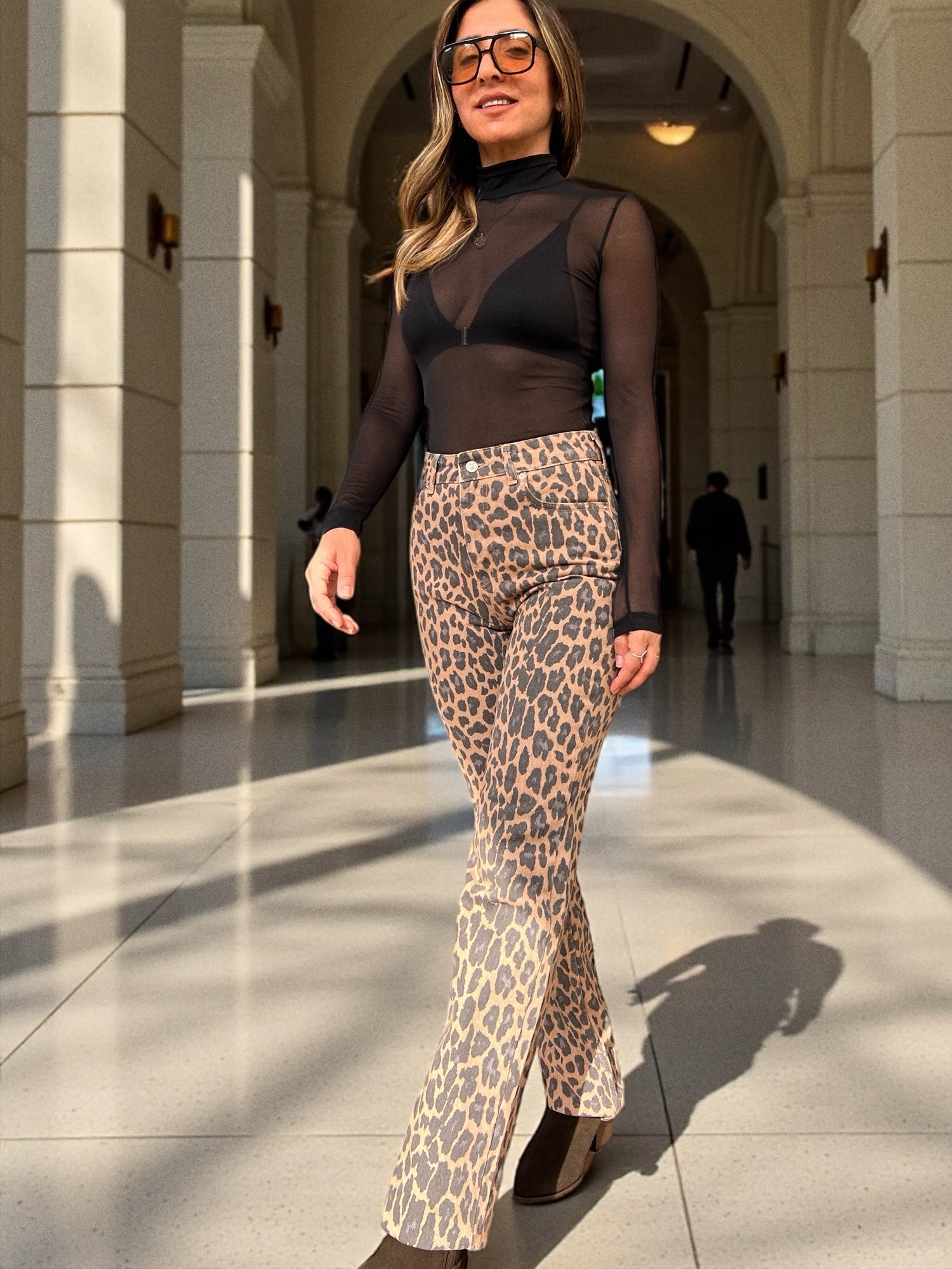 ג’ינס בגזרת סטרייט־פלאייר עם הדפס מנומר מודגש, עשוי בד נוח ומחמיא שמעניק לוק אופנתי ובולט. מושלם לשילוב עם טופים חלקים וליצירת הופעה מלאת סטייטמנט.