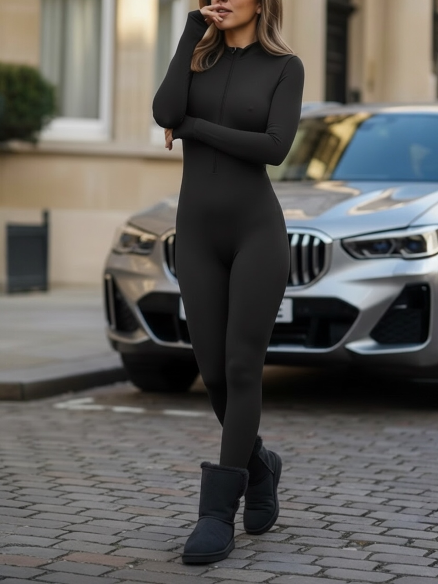 אוברול שלם צמוד בגוון שחור או חום קפה עם רוכסן קדמי ושרוולים ארוכים.