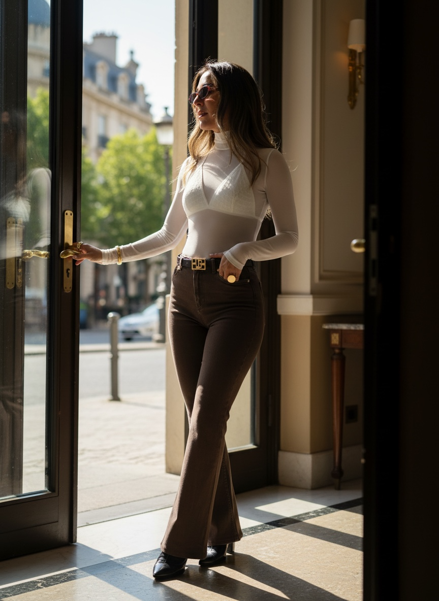 הצהרה של סטייל נועז ומתוחכם. חולצת רשת שקופה בגזרה צמודה שמלטפת את הגוף ומבליטה את הקווים הנשיים בצורה אלגנטית ומדויקת. צווארון גבוה ושרוולים ארוכים מעניקים מראה יוקרתי ואופנתי, בעוד השקיפות העדינה יוצרת משחק מושלם בין חושניות לאלגנטיות.