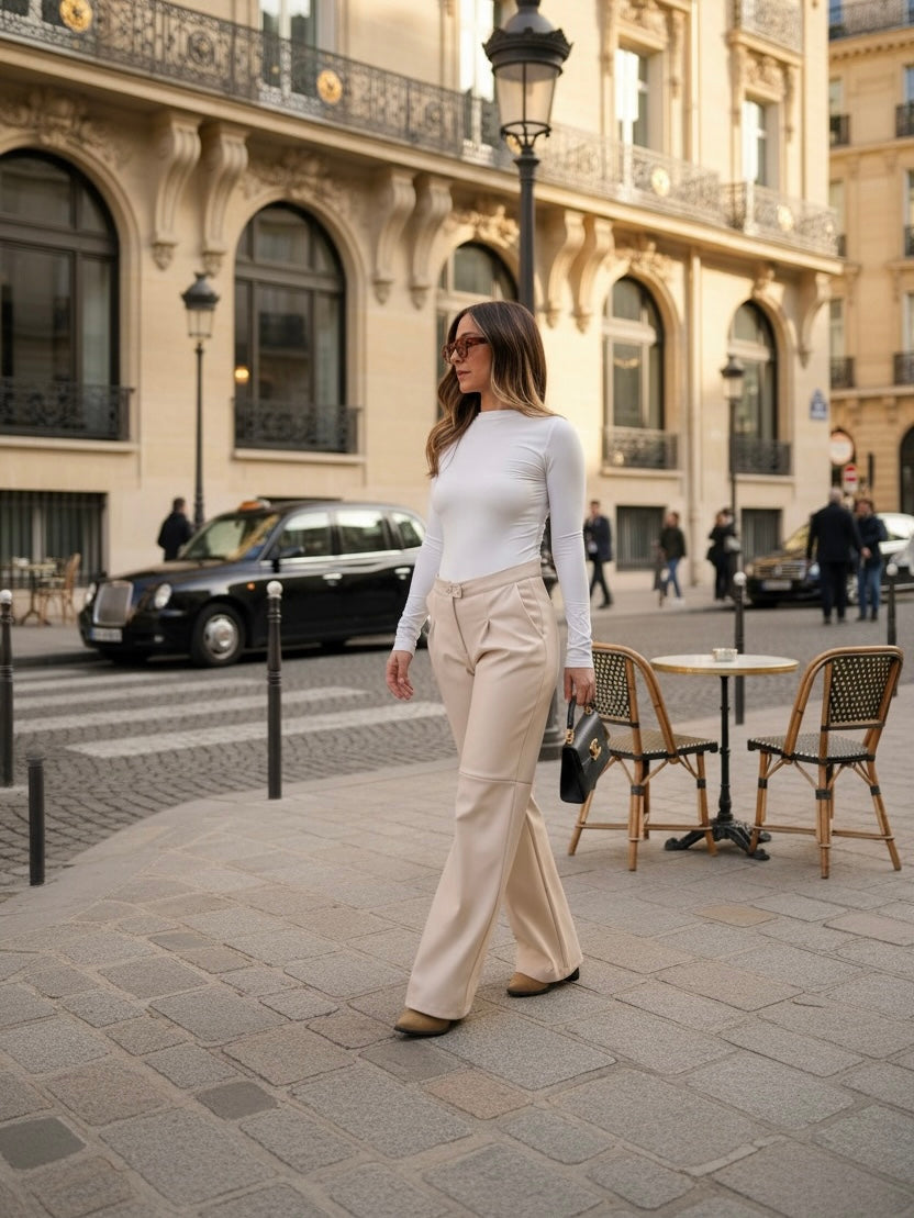 גזרה גבוהה עם רגל ישרה־רחבה יוצרת סילואט מחויטת ומאוזנת, שמתאימה גם ליום עבודה וגם ליציאה אלגנטית בערב.