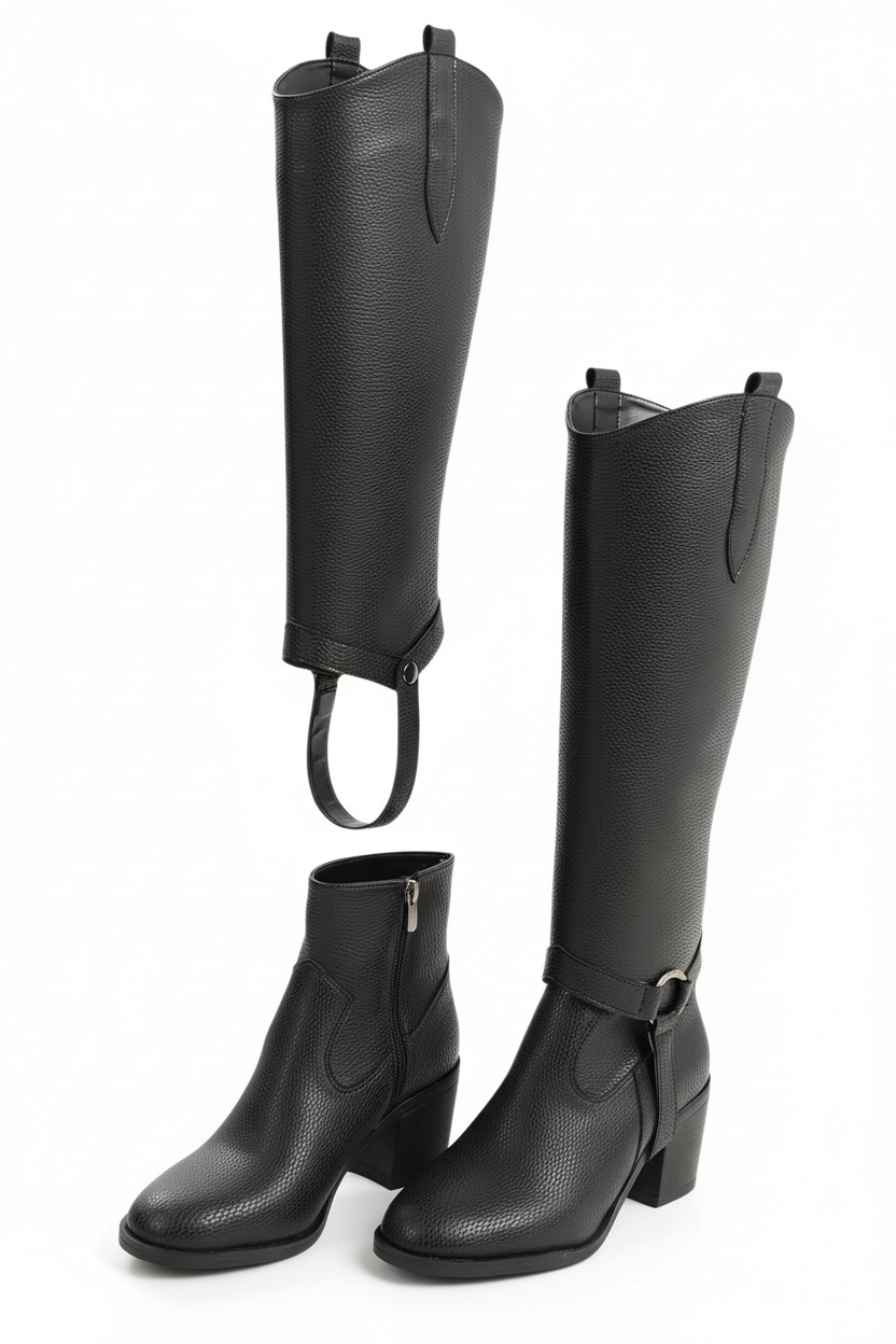 מגפי נשים שחורים דמויי-עור בעיצוב ייחודי וחכם: מגף קרסול קלאסי המגיע עם תוספת שרוול רכיבה גבוה הניתן לחיבור וניתוק בקלות, לקבלת שני לוקים שונים במגף אחד.