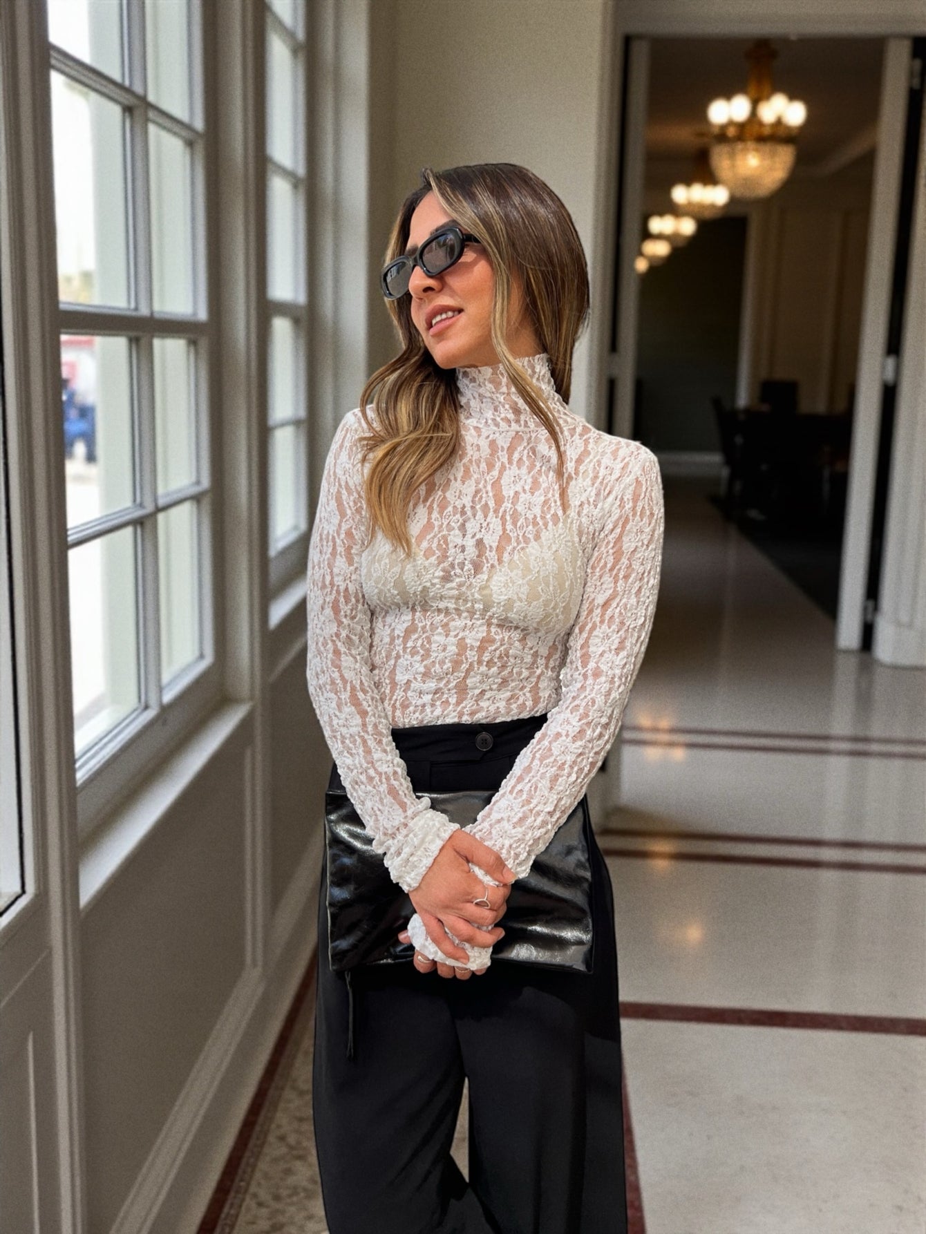 גזרת צוואר גבוהה ושרוולים ארוכים יוצרים מראה מתוחכם ואלגנטי, בעוד שהבד השקוף מוסיף נגיעה חושנית וקלילה.