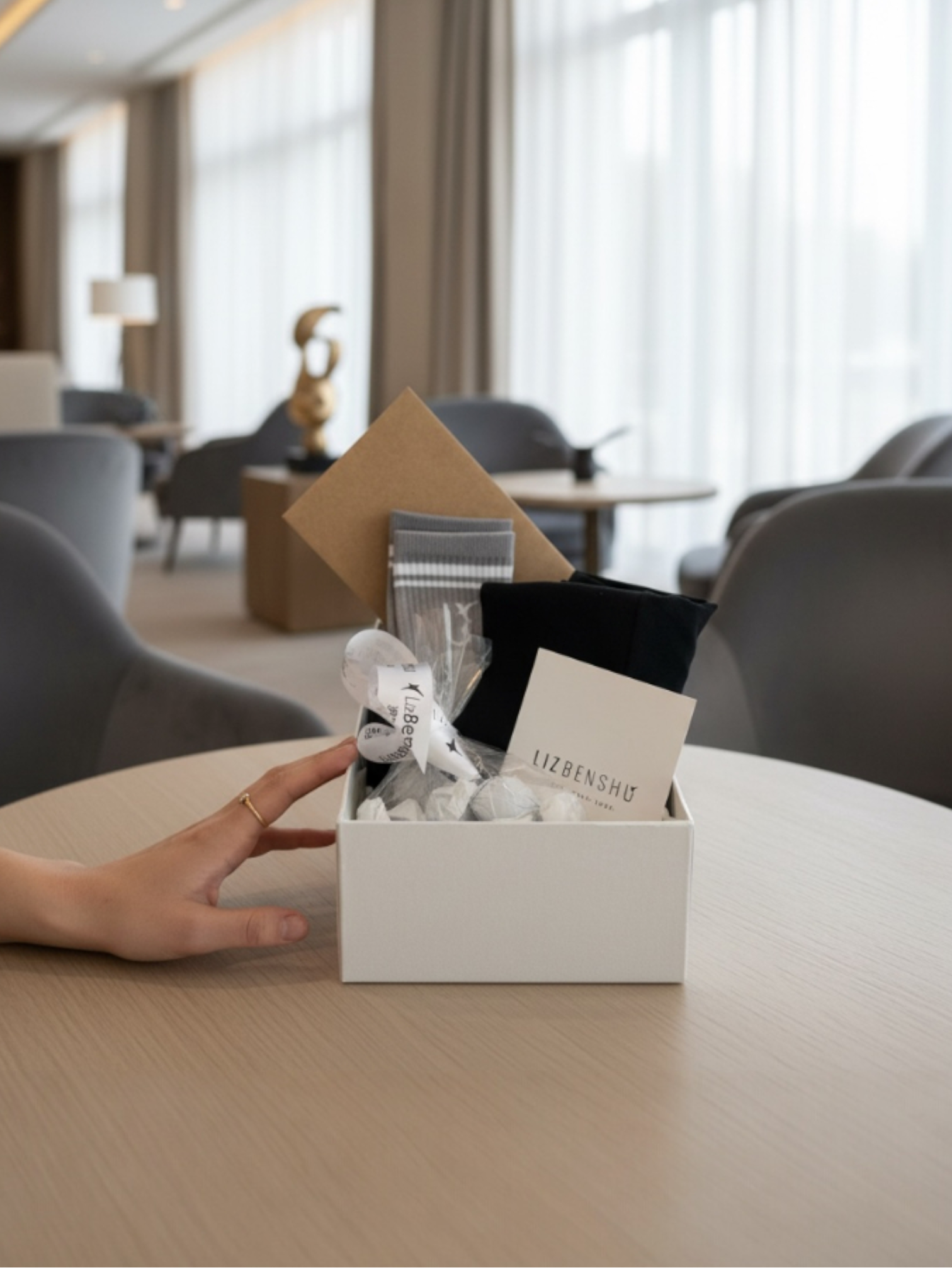 מארז יוקרתי המכיל טייץ' קימי, גרבי המותג, שוקולדים, קלף, כרטיס איש