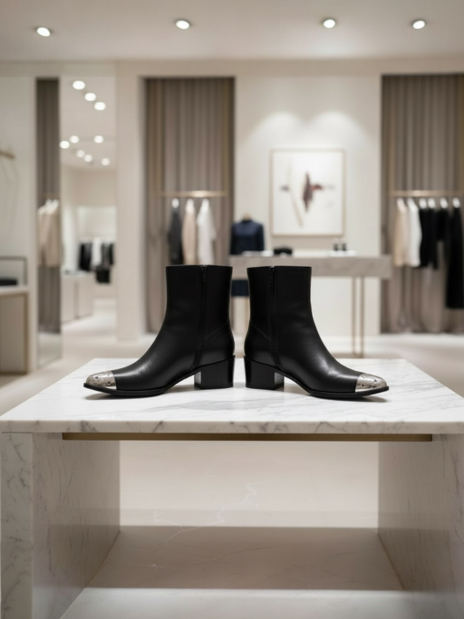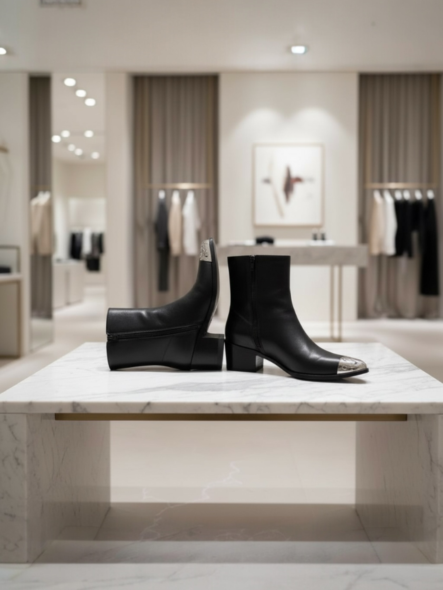 מגפי נשים שחורים בגובה קרסול, בעיצוב נקי ומהודק עם טאץ' מתכתי מרהיב בקדמת המגף. החרטום המעוצב בפרטיות כסף מוסיף נוכחות יוקרתית ונועזת, ויוצר הופעה שמחברת בין אלגנטיות מודרנית לסגנון אדג'י.