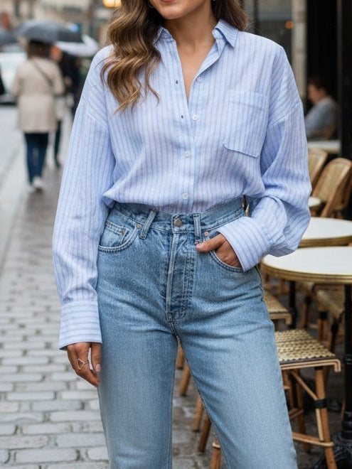 החולצה שתרצי ללבוש שוב ושוב – מכופתרת פסים קלאסית בגזרת בוי-פרנד משוחררת ומדויקת. עשויה מבד נעים, נושם וזורם, בגוון תכלת רך או ירוק מרענן – לשיק נקי עם נוכחות נינוחה.