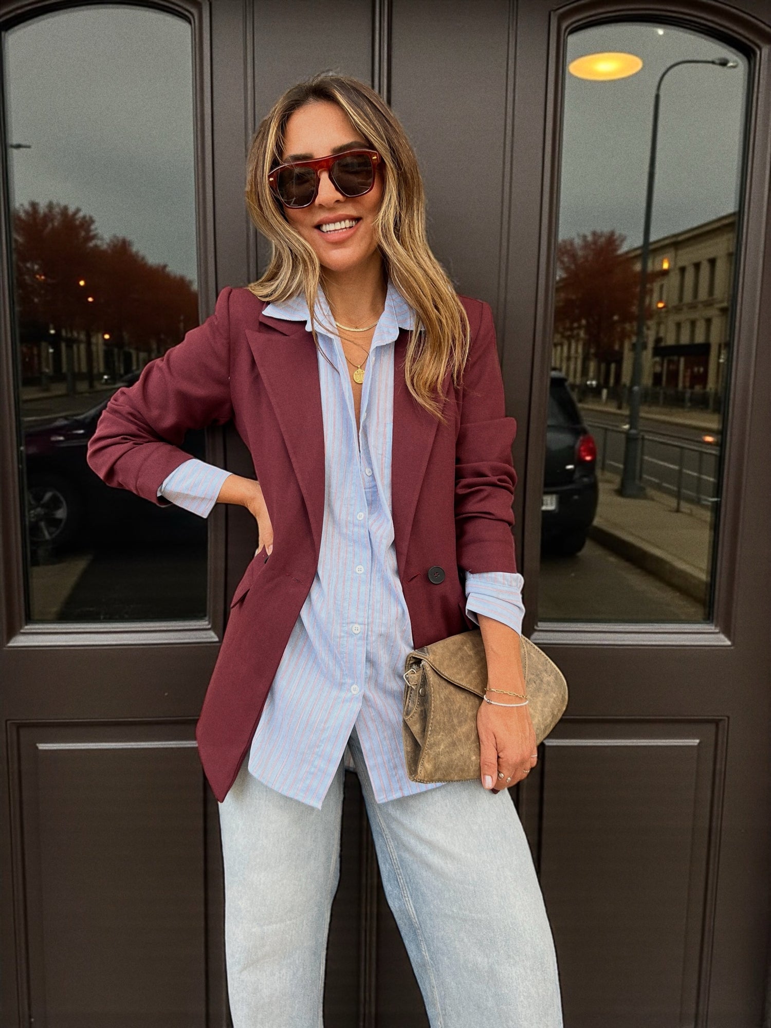 בלייזר מחויט בגזרה מדויקת ונקייה, עם כתפיים מובנות, בטנת פסים עדינה ושרוולים שניתן לקפל לסטייל משוחרר. זהו פריט חובה במלתחה – כזה שמשדר אלגנטיות, כוח וקלילות בו-זמנית.