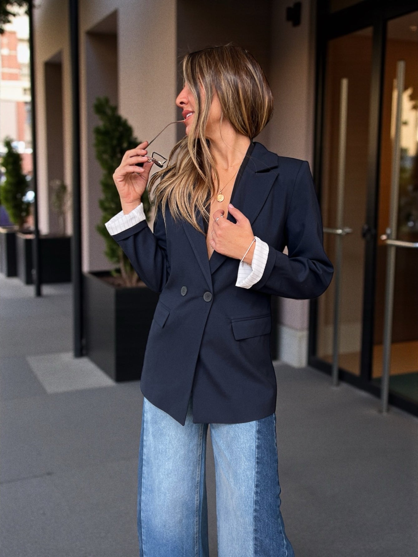 בלייזר מחויט בגזרה מדויקת ונקייה, עם כתפיים מובנות, בטנת פסים עדינה ושרוולים שניתן לקפל לסטייל משוחרר. זהו פריט חובה במלתחה – כזה שמשדר אלגנטיות, כוח וקלילות בו-זמנית.