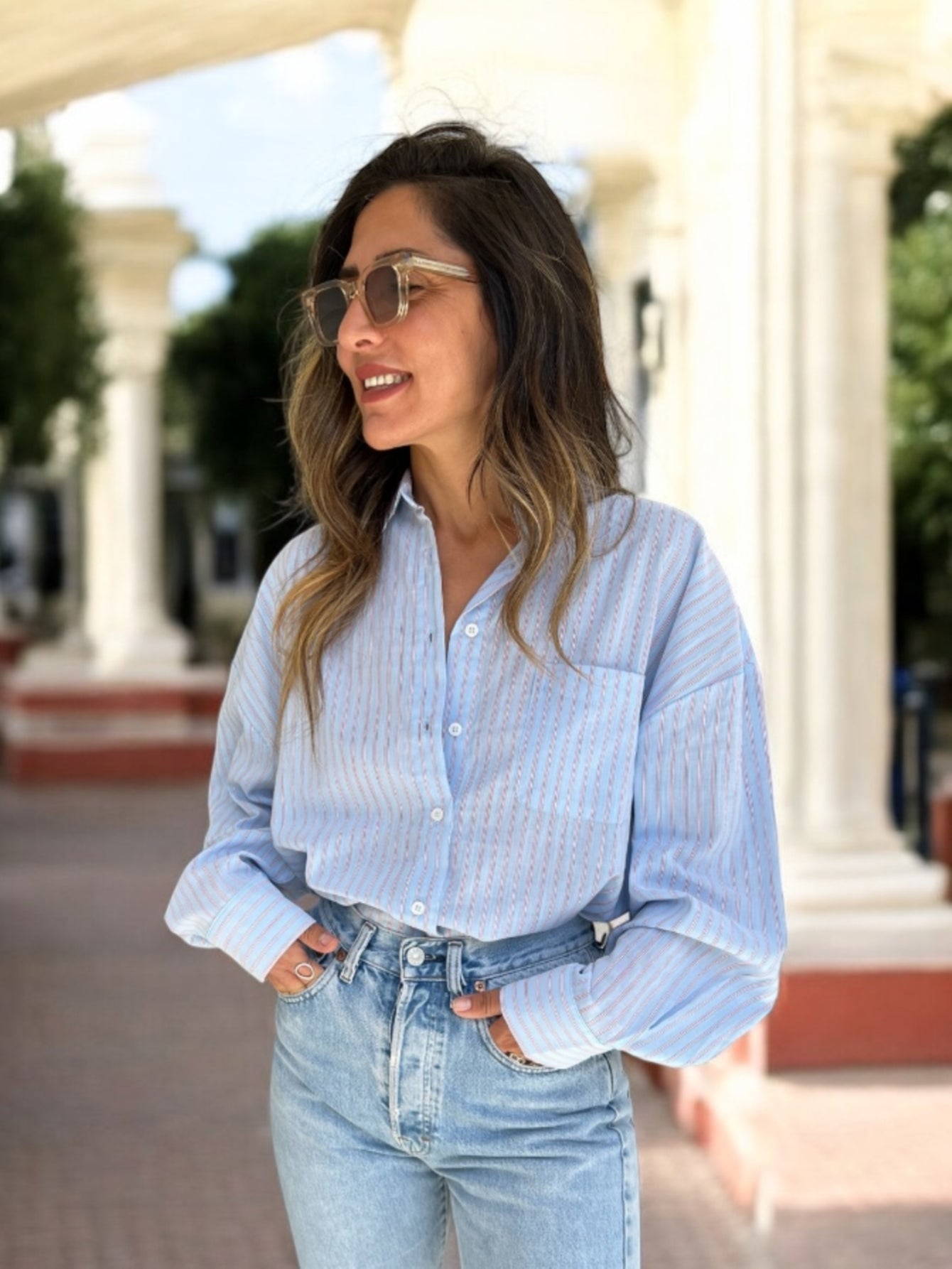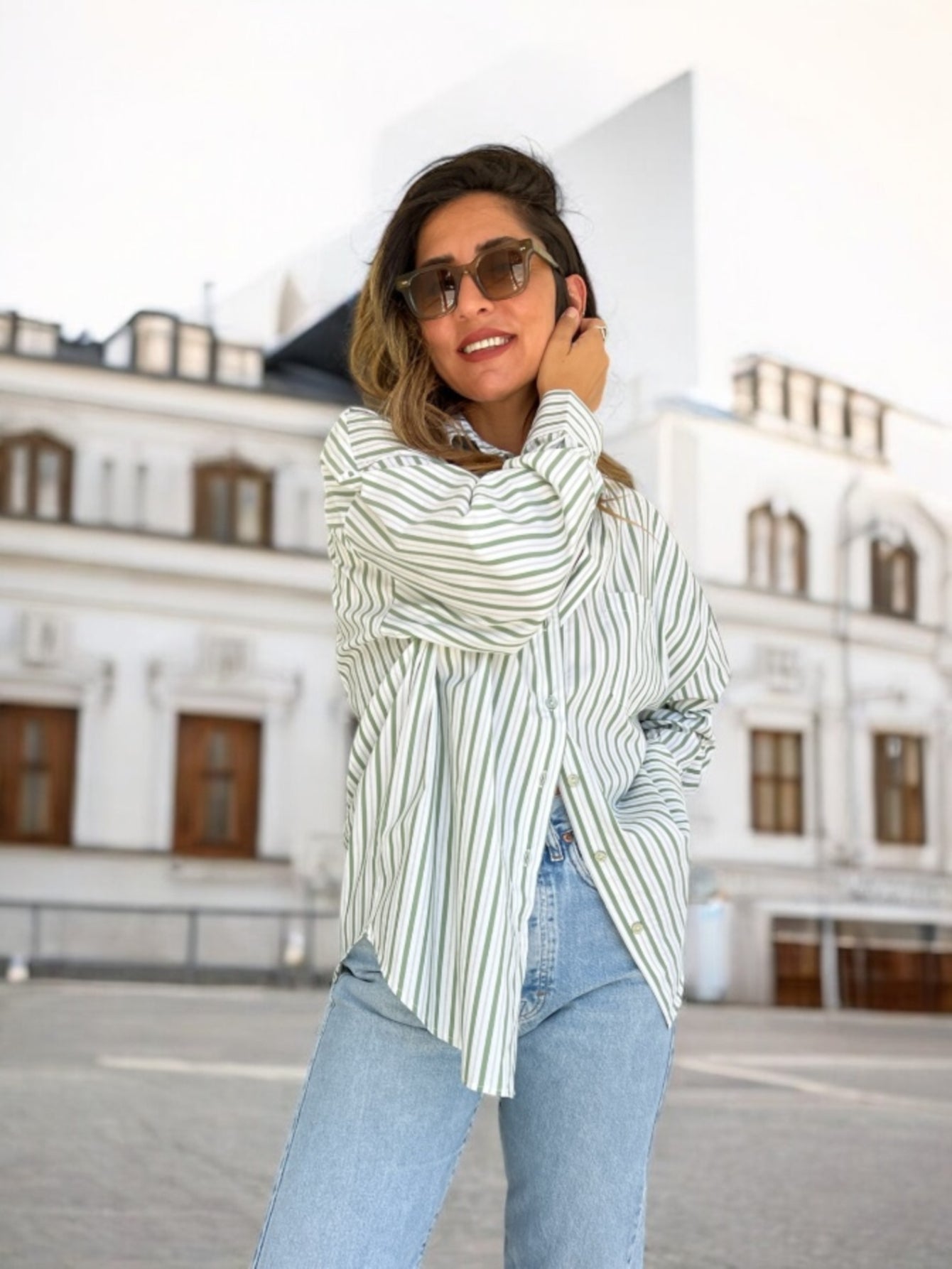 החולצה שתרצי ללבוש שוב ושוב – מכופתרת פסים קלאסית בגזרת בוי-פרנד משוחררת ומדויקת. עשויה מבד נעים, נושם וזורם, בגוון תכלת רך או ירוק מרענן – לשיק נקי עם נוכחות נינוחה.